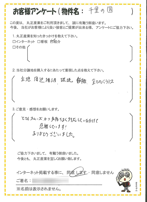 土地選びで重要視されるポイントが「千里の国」に当てはまり本当に良かったです。
